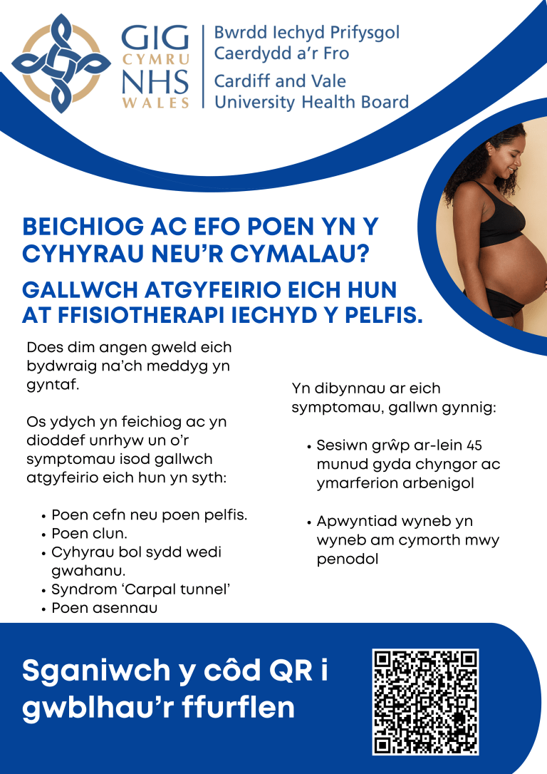 Os oes gennych unrhyw ymholiadau BRYS yn ymwneud â Ffisiotherapi Iechyd y Pelfis, ffoniwch 02920 335717 a gadewch neges ar y peiriant ateb. Byddwn yn cysylltu â chi cyn gynted ag y gallwn.
